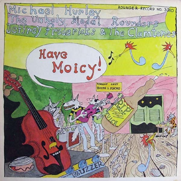 Hurley painted his own cartoony album covers (to this day), often starring his alter egos Boon and Jocko, and he created a whole world populated by werewolves, jungle pigs and working-class guys who fought with their girlfriends who liked to unwind down at the local tap room. A sometime associate of Peter Stampfel and the Holy Modal Rounders, he created a stone classic with them (not to mention Jeffrey Frederick and the Clamtones) called “Have Moicy” that came out on Rounder in 1976.
