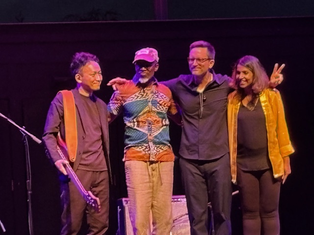 APQ takes a bow. Shah is at right, Ross second from right. Rudy Royston is a regular fill-in on drums. And Nakamura is an outstanding bass player. (Jim Motavalli photo)