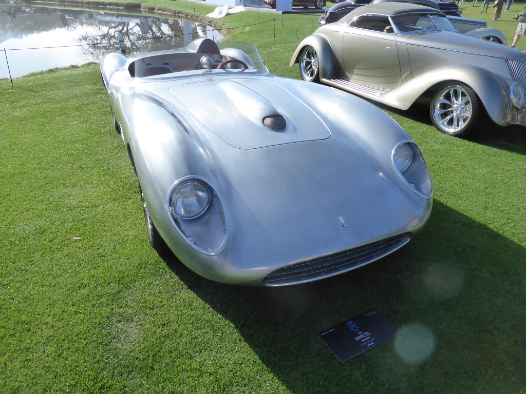 1959 Marcel Roadster. “A lot of one-offs here,” said a busy photographer. The car isn’t actually from 1959, though it looks the part. It was created by panel shaper Luc De Lay, son of Marcel De Lay of Marcel’s Custom Metal, with help from the ubiquitous Chip Foose. De Lay was inspired by late-50s Ferraris, Maseratis and Astons. Under the hood is a GM small-block LS3, mated to a Tremec six-speed manual. It should handle better than those legendary ‘50s cars, because it has modern four-wheel independent suspension, four-wheel discs, and cast-aluminum knock-off wheels. “It’s a driver,” De Lay says.