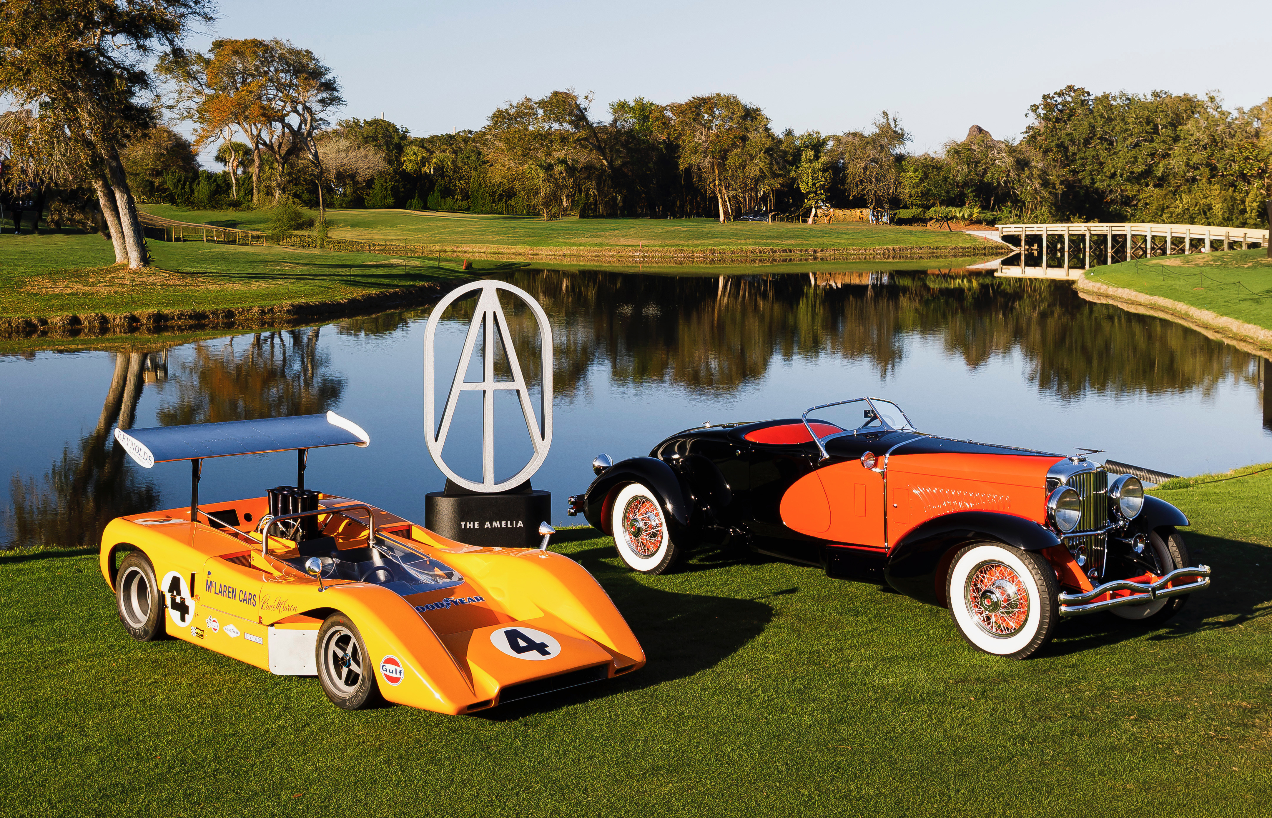 There were an estimated 250 collector cars on the field. Best in show on the concours side was a boldly orange-and-black 1931 Duesenberg Model J “Tapertail” Speedster by Weymann, and on the sport side it was a race-winning 1969 McLaren M8B.