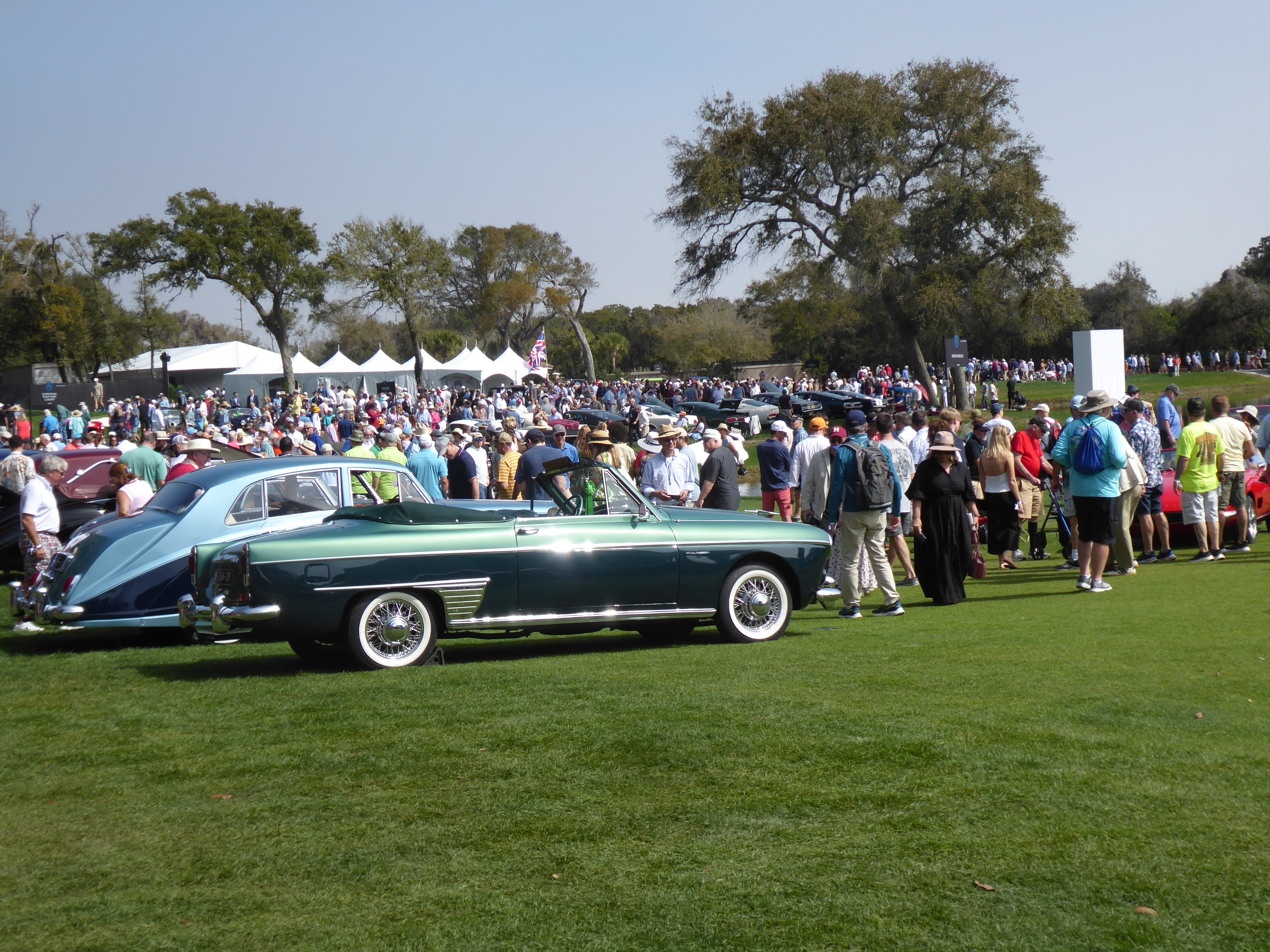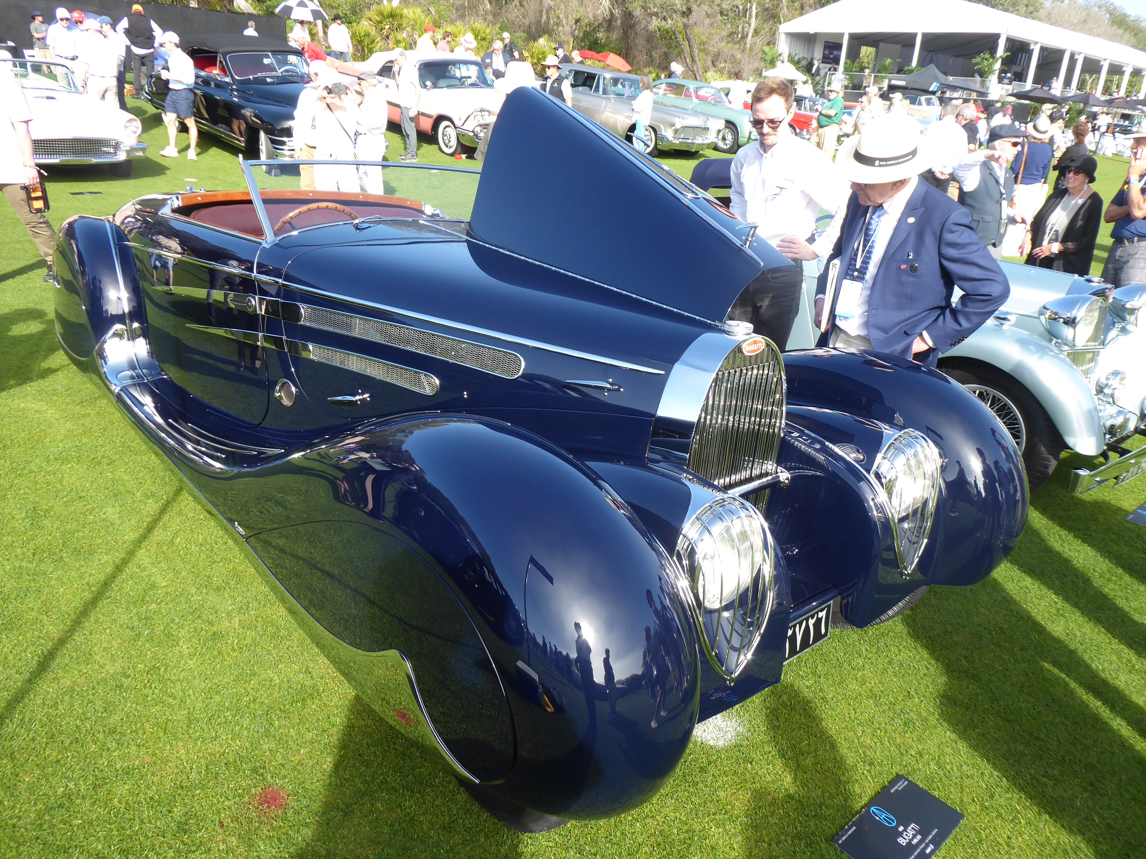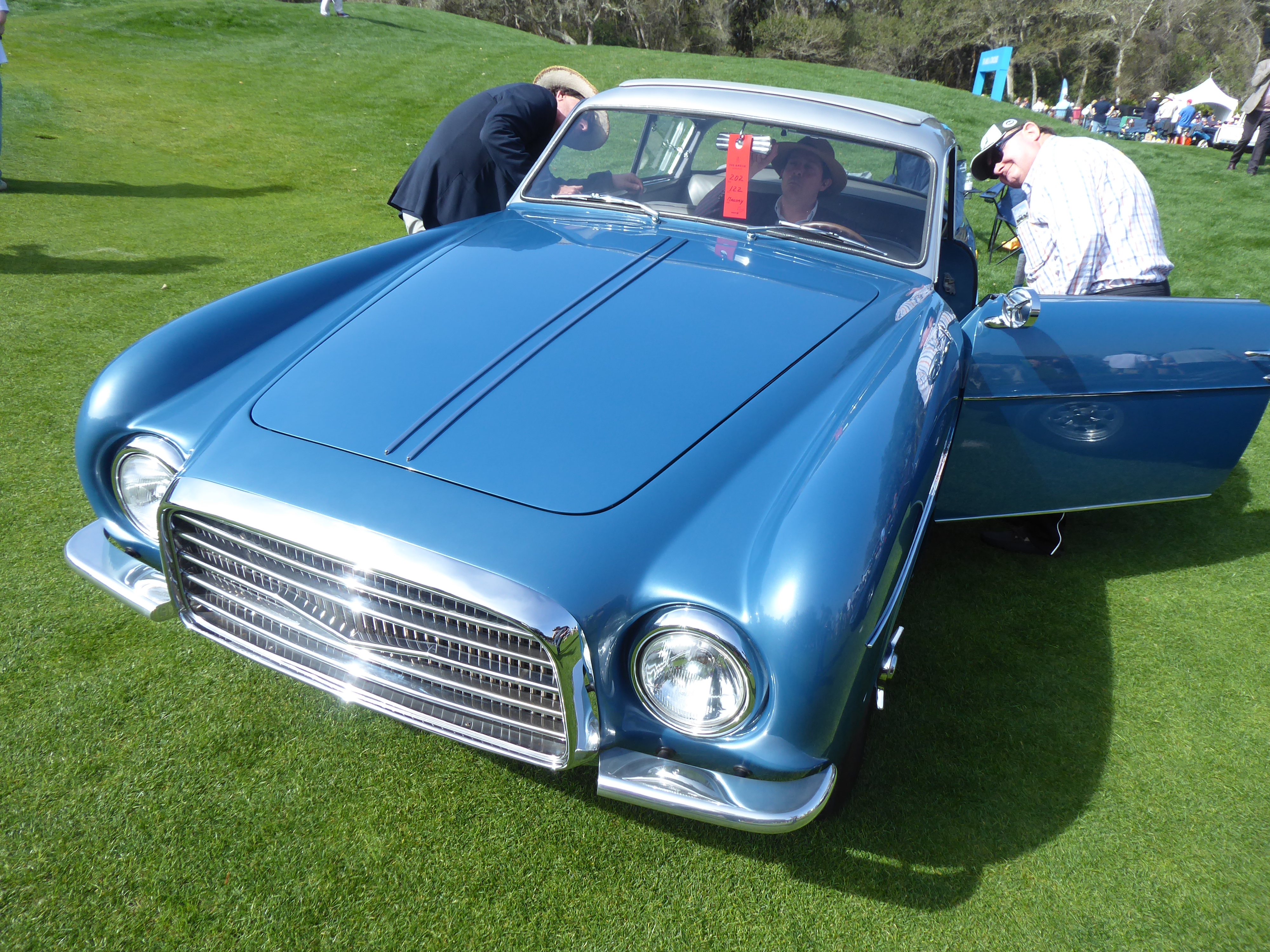 1939 Bugatti 57C. This was my nominee for best in show, with styling that borrows much from French coachbuilder Figoni and Falaschi (but is actually the work of fellow French firm Vanvooren). This car was a gift from France to the first Shah of Iran, Muhammed Reza Pahlavi upon his wedding, and kept in that country until 1959, when it sold, in derelict condition with an American V-8, for the remarkable sum of $275. It’s currently the property of the Petersen Museum in Los Angeles, and collections technician Casey Van Houten told me, “I’m just glad it made it here and is now safely on the field.”