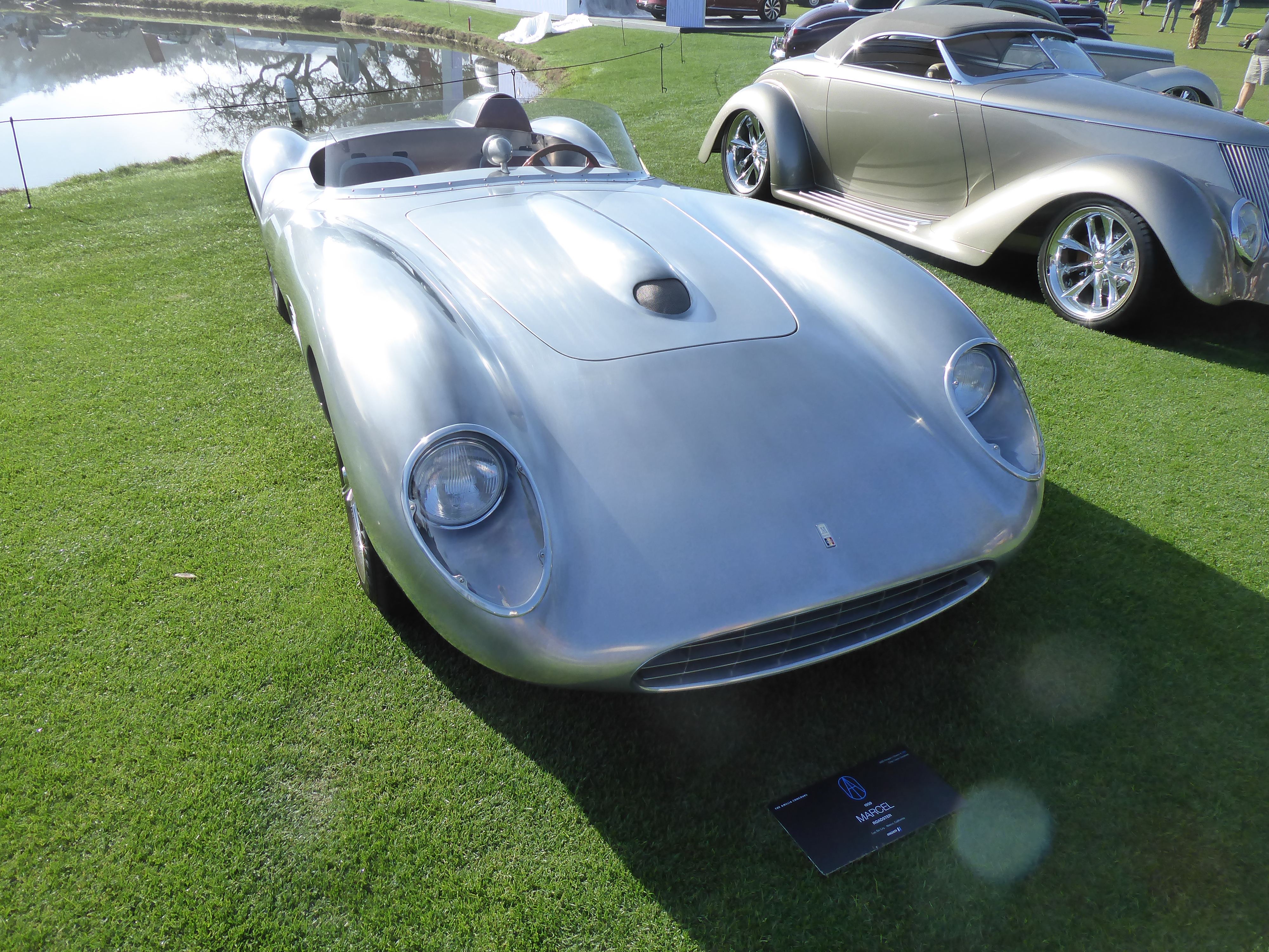 1959 Marcel Roadster. “A lot of one-offs here,” said a busy photographer. The car isn’t actually from 1959, though it looks the part. It was created by panel shaper Luc De Lay, son of Marcel De Lay of Marcel’s Custom Metal, with help from the ubiquitous Chip Foose. De Lay was inspired by late-50s Ferraris, Maseratis and Astons. Under the hood is a GM small-block LS3, mated to a Tremec six-speed manual. It should handle better than those legendary ‘50s cars, because it has modern four-wheel independent suspension, four-wheel discs, and cast-aluminum knock-off wheels. “It’s a driver,” De Lay says.